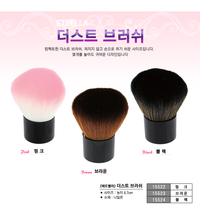 | 제품설명 | 네일 파일 작업 후에 생긴 큐티클 잔여물 등을 재빨리 청소할 수 있는 네일 더스트 브러쉬입니다. 컴팩트한 사이즈의 더스트 브러쉬. 부피가 크지 않아 잡기 쉬운 사이즈입니다. 몇 개를 늘어놔도 귀여운 디자인입니다. |