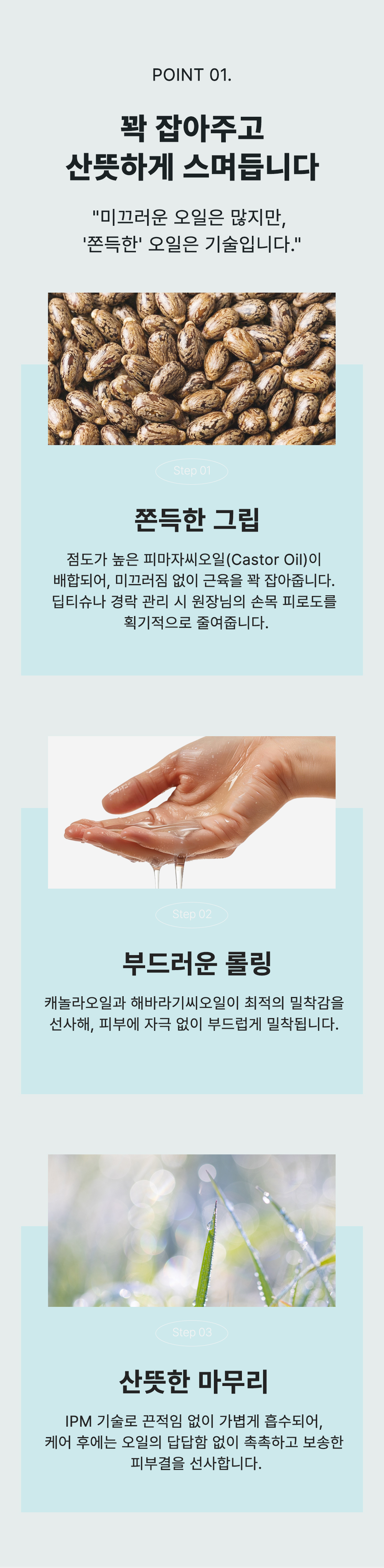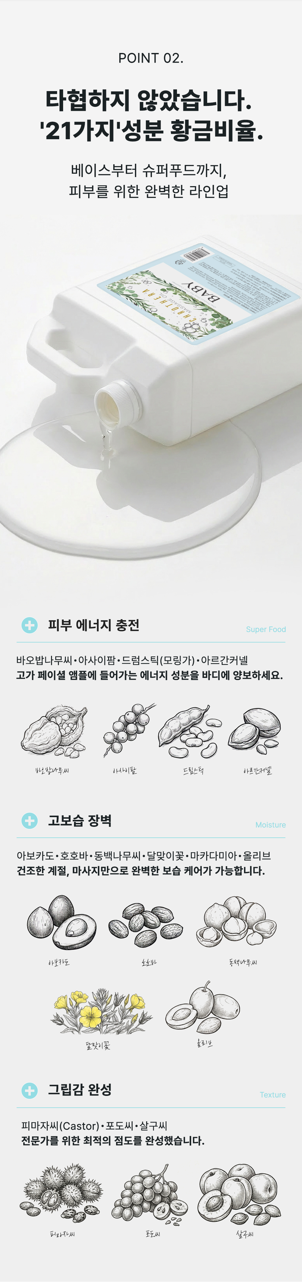 | 전성분 | 미네랄오일, 아이소프로필미리스테이트, 솔비탄세스퀴올리에이트, 향료, 자색201호, 라벤더오일(0.00001%), 캐놀라오일, 아르간커넬오일, 아보카도오일, 피마자씨오일, 포도씨오일, 동백나무씨오일, 해바라기씨오일, 마카다미아씨오일, 올리브오일, 로즈마리잎오일, 달맞이꽃오일, 살구씨오일, 레몬향티트리오일,바오밥나무씨오일, 바바수씨오일, 드럼스틱씨오일, 아사이팜열매오일, 유칼립투스잎오일, 호호바씨오일 |