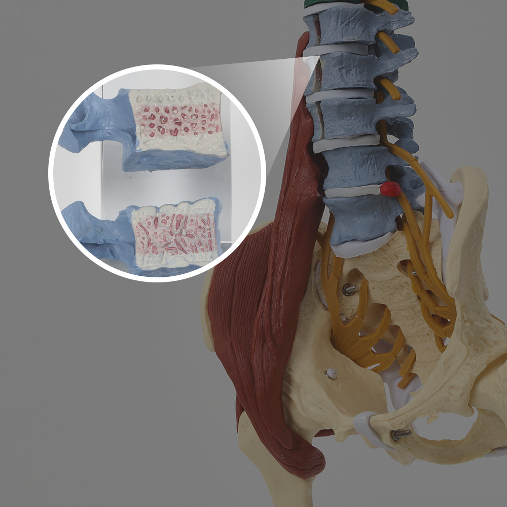 | 제품설명 | 경부 및 골반 주변의 내부 근육을 3D로 표현했습니다. 경부, 요추, 고관절의 불균형 요인이나 접근하는 근육, 인대・신경의 구조를 시각적으로 확실하게 상대방에게 전달할 수 있도록 제작되었습니다. 실제 골격에서 형틀을 따온 실물 크기로 성인 인체 골격 모형입니다. 고관절 오른쪽은 건강체, 왼쪽은 골다공증을 표현하고 있으며, L4와 5번 사이는 추간판탈출증을 표현하고 있습니다. L1~3까지의 요추는 분해가 가능하며, 단면에는 골다공증에 이르기까지의 병변 과정이 표현되어 있습니다. 근육은 후두하근군(대후두직근, 소후두직근, 상두사두근, 하두사두근), 사각근(전사각근, 중사각근, 후사각근), 두최장근(C7 횡돌기에서만 표현되어 있습니다. 정지부인 유양돌기가 없기 때문에 기시부만 표현), 장요근(장골근, 대요근), 소전근, 중전근(중전근은 소전근을 보여주기 위해 기시부, 정지부만 표현), 심부외회전근 일부(배형근 기시부에 대해 천골(앞면)과 장골(대좌골 절흔 가장자리)인대, 해당 제품은 장골에 대해 재현하고 있으며, 천골에 부착은 부분적인 근육 표현으로 생략)을 표현하고 있습니다. 혈관은 척추동맥, 상소뇌동맥, 뇌저동맥, 미로(내이)동맥, 전하소뇌동맥, 윌리스 동맥륜(모두 일체 성형)을 표현하고 있습니다. 뼈는 후두골 일부, 갈비뼈 일부, 경추, 흉추, 요추, 천골, 천골, 대퇴골, 대퇴골로 구성되어 있습니다. 모형은 움직일 수 없으며, L1~3번 요추를 제외하고는 분해할 수 없습니다. 모형은 스탠드에서 분리할 수 있습니다. |