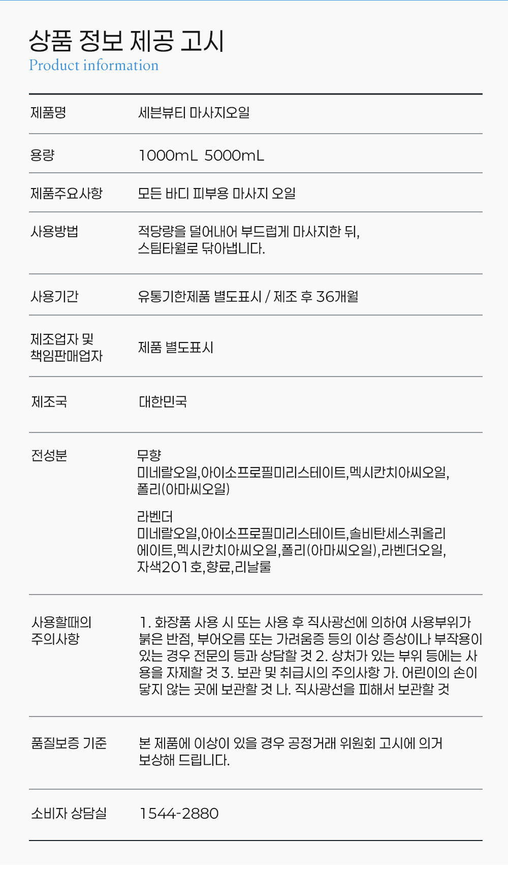 | 제품명 | 세븐뷰티 마사지 오일 베이비 5L |