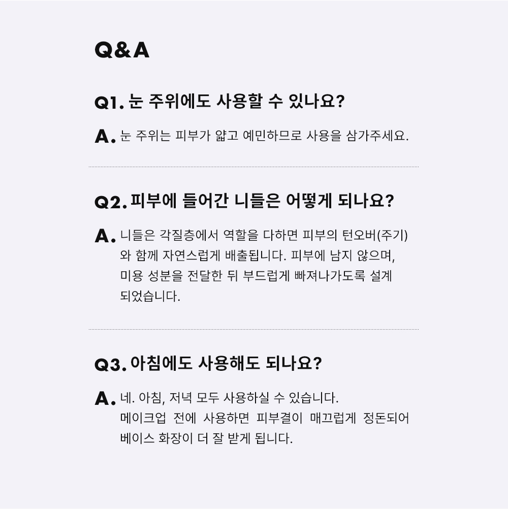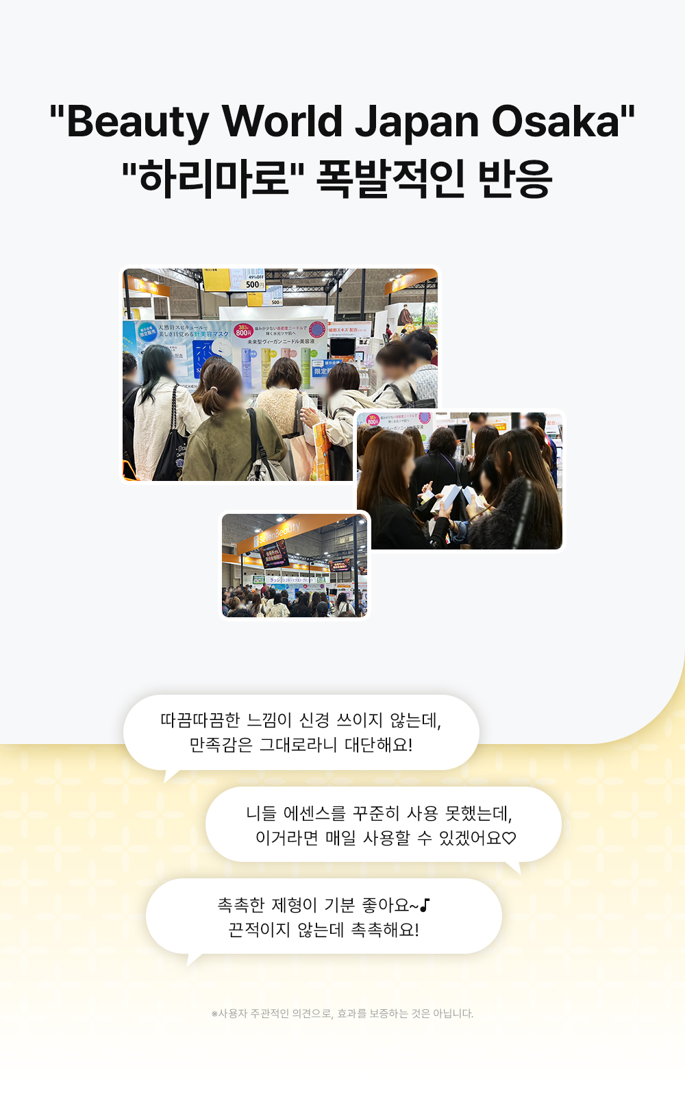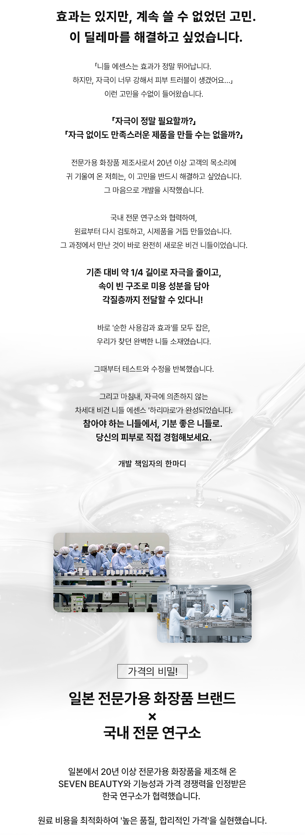 | 제품설명 | 따가운 니들 에센스, 효과 보려다 피부 상할까 봐 걱정되셨죠? '하리마로'는 자극을 1/4로 줄인 특허받은 비건 니들이 유효 성분을 피부 속까지 직접 전달합니다. 이제 아프지 않게, 쓰던 앰플 효과까지 끌어올려 속부터 차오르는 광채를 경험하세요. 참는 뷰티는 그만! 매일 편안하게 즐기는 스페셜 홈케어, '하리마로'로 시작하세요. |