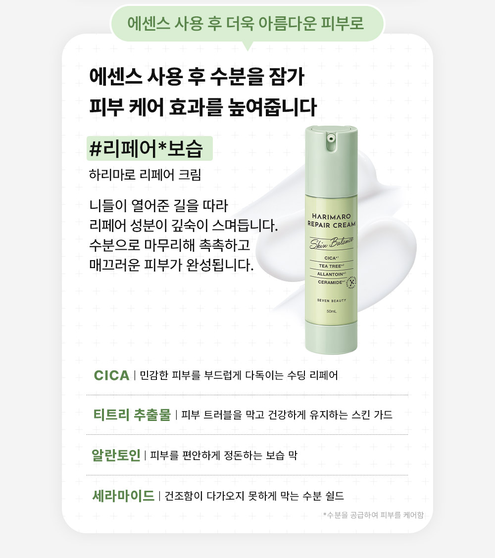 | 사용방법 | 아침저녁, 세안 후 눈가를 피해 적당량을 얼굴 전체에 바르고, 손바닥으로 감싸듯 눌러 흡수시켜 줍니다. 그 후, 토너 등으로 보습해주세요. 마무리로 리페어 크림을 사용해, 수분이 날아가지 않도록 막아줍니다. |