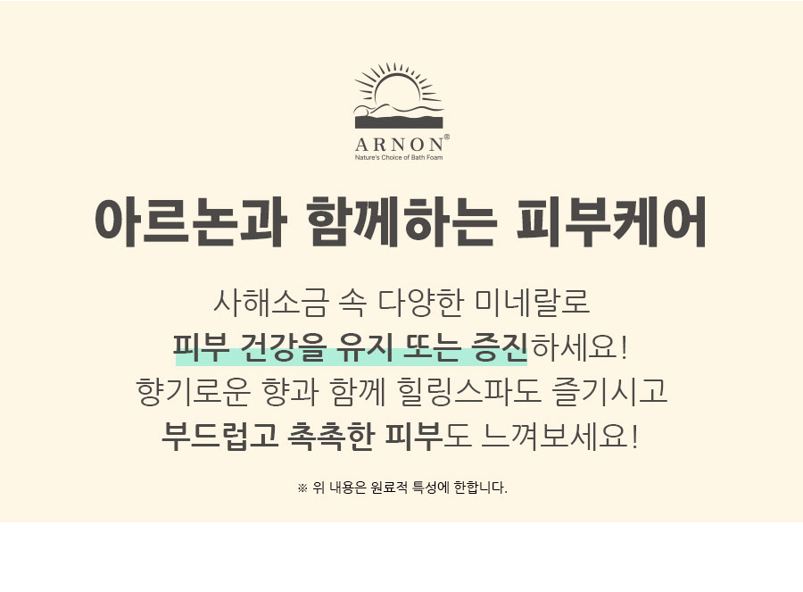 2. 아르논 사해소금 입욕제를 적당량 넣고 잘 녹여주세요 3. 목욕시간은 15~20분 사이가 적당합니다. 4. 목욕을 마치면 살짝 헹궈만 주세요 사용량 입욕 : 60~100g / 반신욕 : 40~45g / 족욕 : 10~20g / 세안,두피 : 10g |