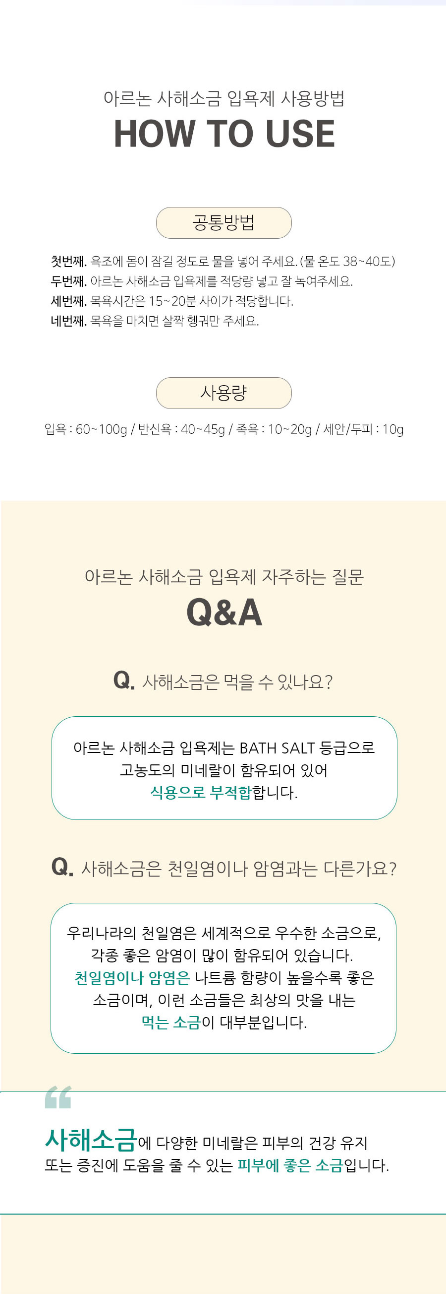 2. 아르논 사해소금 입욕제를 적당량 넣고 잘 녹여주세요 3. 목욕시간은 15~20분 사이가 적당합니다. 4. 목욕을 마치면 살짝 헹궈만 주세요 사용량 입욕 : 60~100g / 반신욕 : 40~45g / 족욕 : 10~20g / 세안,두피 : 10g |