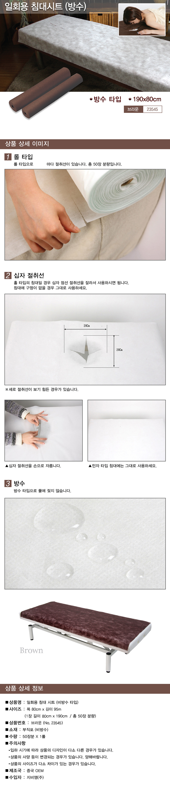 | 제품설명 | 롤 타입의 종이 시트입니다. 190cm (베드당)마다 절취선이 들어 있기 때문에, 당기는 것만으로 침대 1 개 분씩자를 수 있습니다. 홀타입 침대에도 사용 할 수 있는 십자 컷이 있습니다 |
