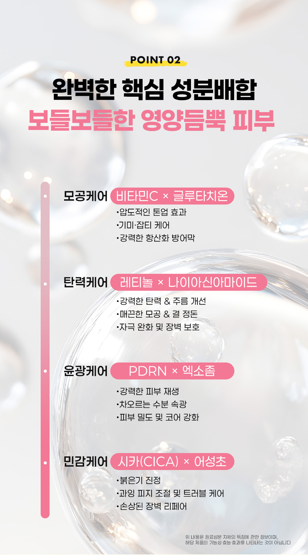 | 전성분 | 정제수,글리세린,글리세레스-26,부틸렌글라이콜,피이지/피피지-17/6코폴리머,에리스리톨,편백수,마트리카리아꽃수,로즈마리잎수,아스코빌글루코사이드,글루타티온,소듐하이알루로네이트,폴리쿼터늄-51,판테놀,나이아신아마이드,아데노신,알란토인,트레할로스,잔탄검,1,2-헥산다이올,다이소듐이디티에이,벤질글라이콜,하이드록시아세토페논,에틸헥실글리세린 |