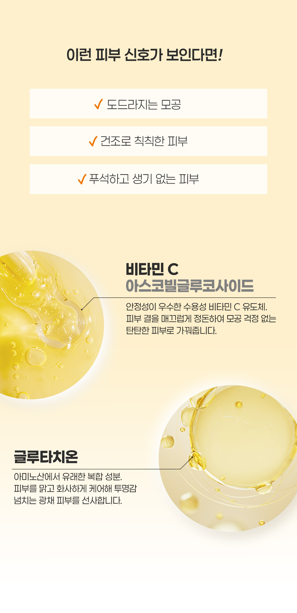 | 제품설명 | 칙칙한 피부를 위한 화사한 생기 충전 솔루션입니다. 비타민C 유도체와 글루타치온, 나이아신아마이드 성분이 맑은 피부 톤으로 가꾸어 주며, 히알루론산과 자연 유래 수(편백수, 마트리카리아꽃수, 로즈마리잎수)가 건조하고 지친 피부에 깊은 수분과 편안한 진정을 선사하는 데일리 마스크팩입니다. |