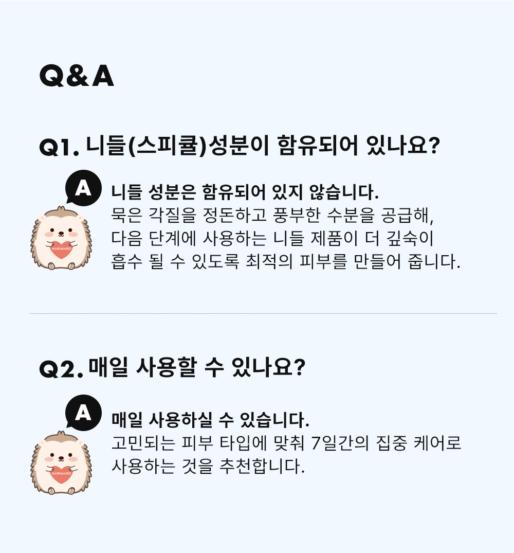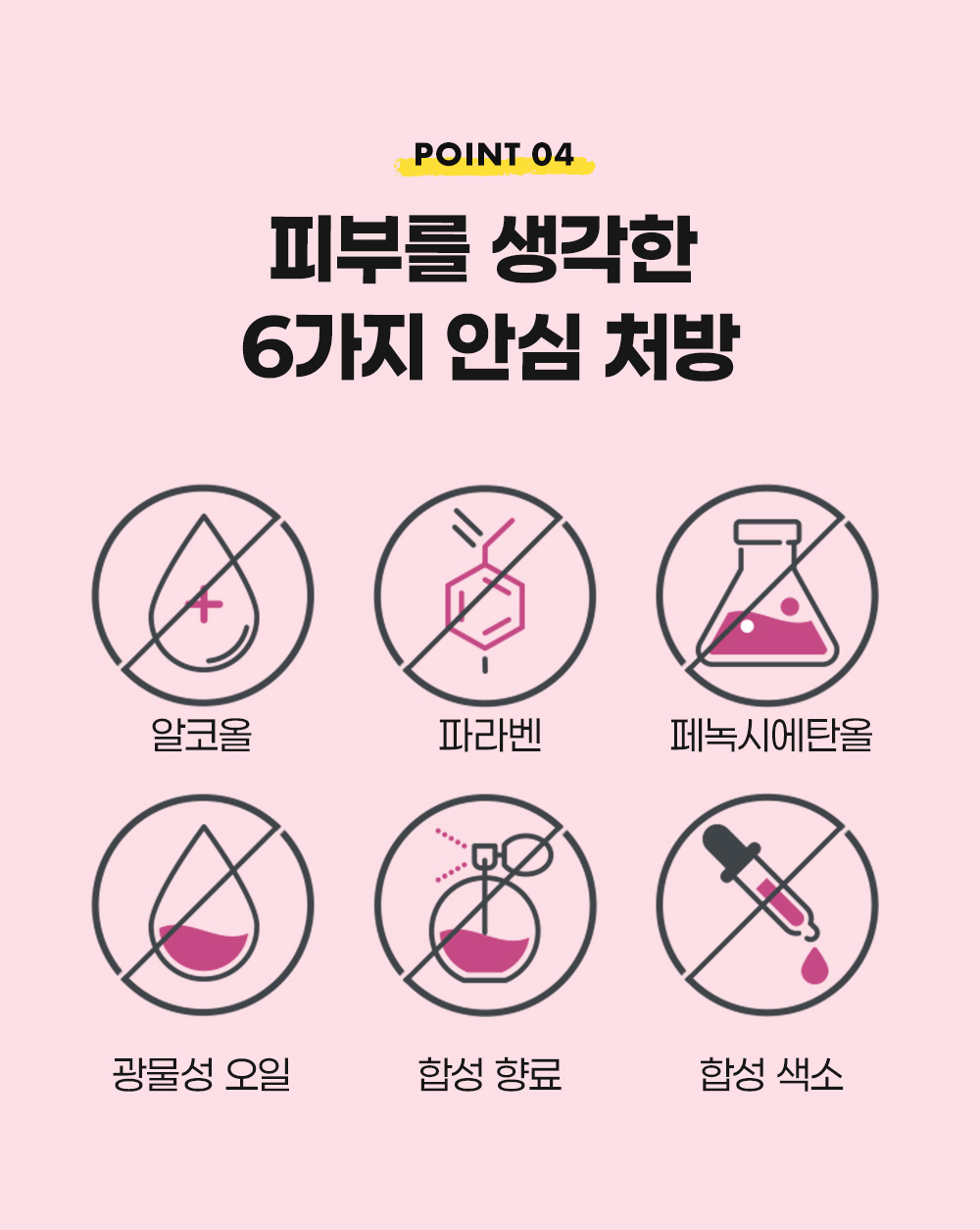 | 주의사항 | *사용시 주의사항* 피부에 이상이 생겨 있지 않은지 주의해서 사용하십시오. 상처 종기 습진 등의 이상이 있는 경우 나 피부에 맞지 않을 때는 사용하지 마십시오. · 사용 중 붉은 가려움증 자극 · 탈색 (백반 등) 짙은 등의 이상이 나타날 경우에는 사용을 중지하고 피부과 전문의 등에 게 상담을 권장합니다. 그대로 사용을 계속하면 증상을 악화시킬 수 있습니다. * 유아의 손이 닿지 않는 곳에 보관하십시오. * 극단 고온 또는 저온의 장소 및 직사광선이 닿는 곳에는 보관하지 마십시오. * 만일 눈에 들어갔을 때는 즉시 씻어주세요. |