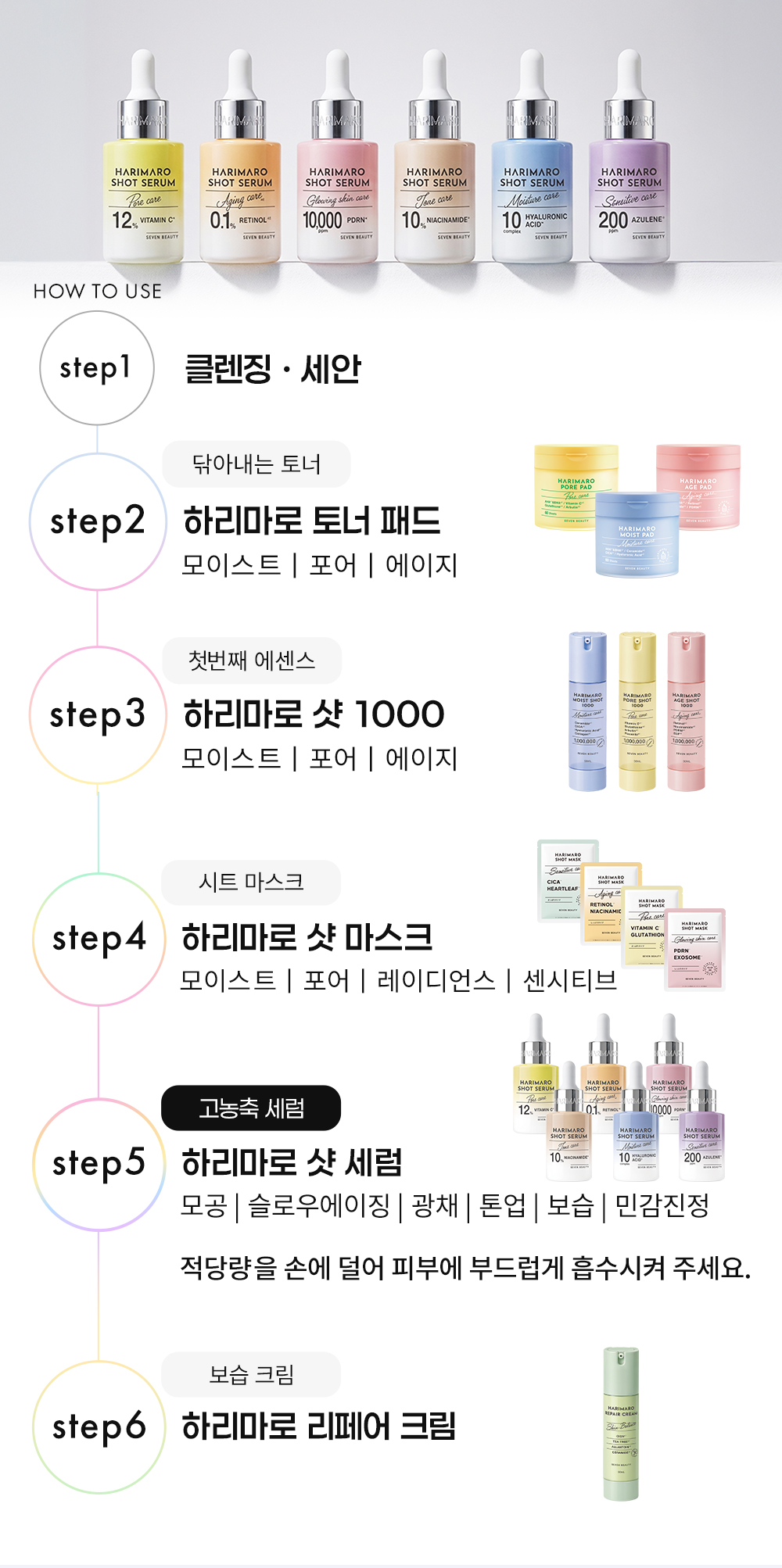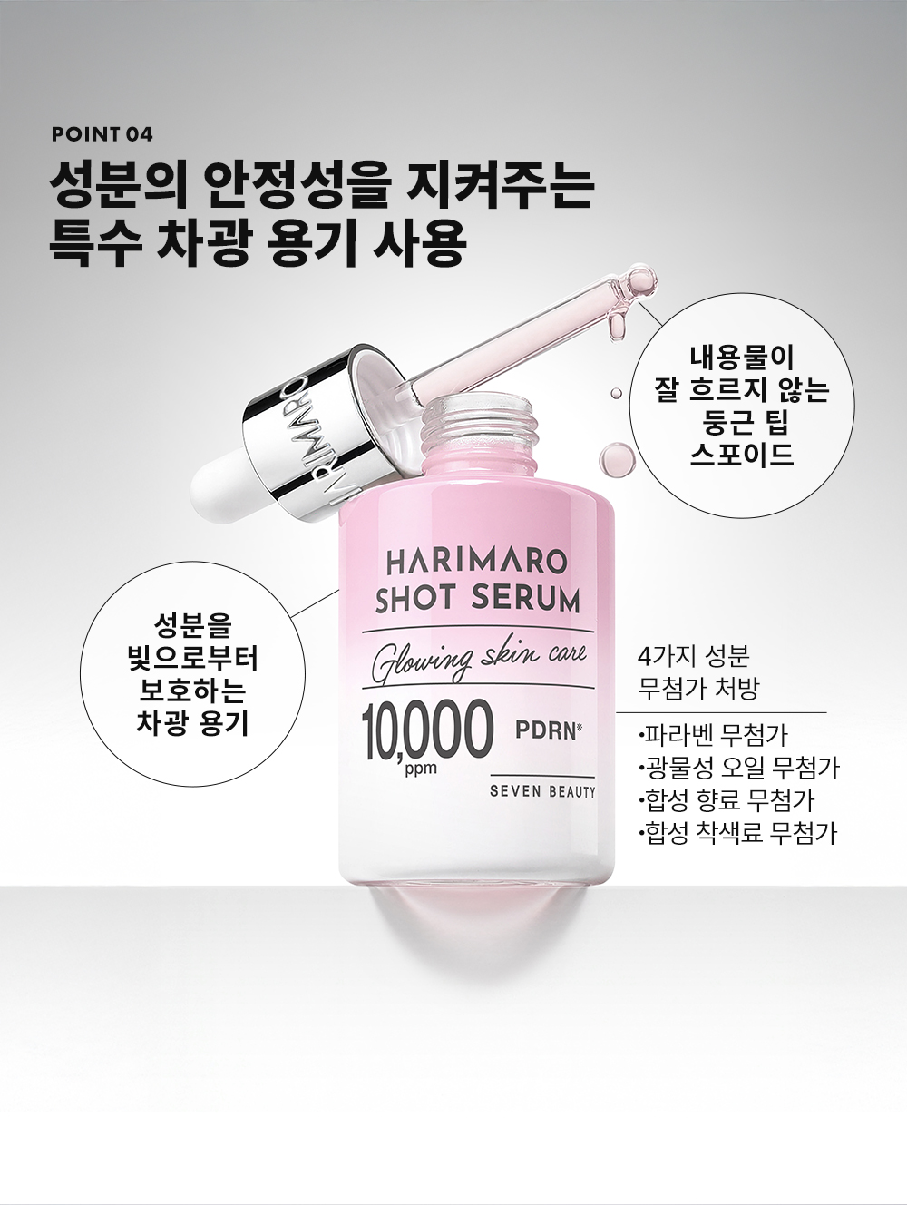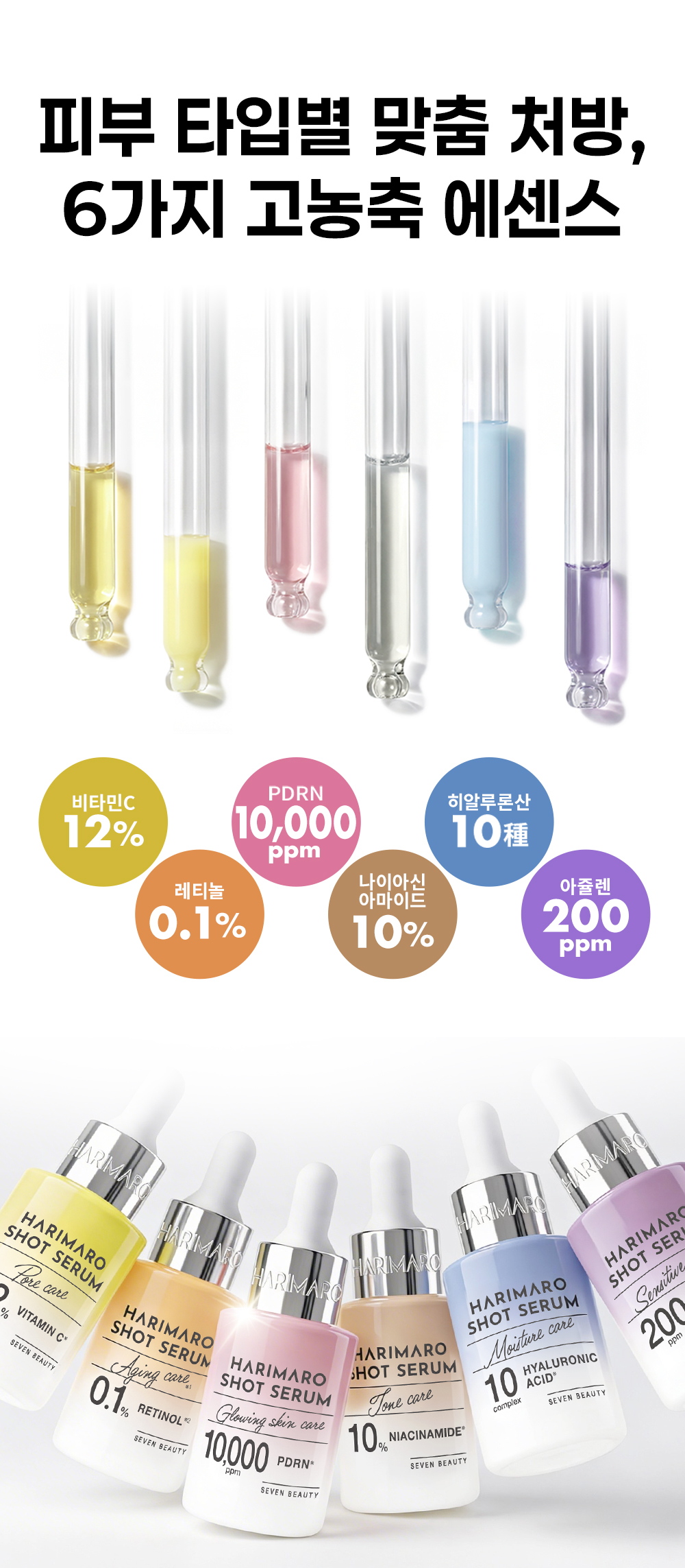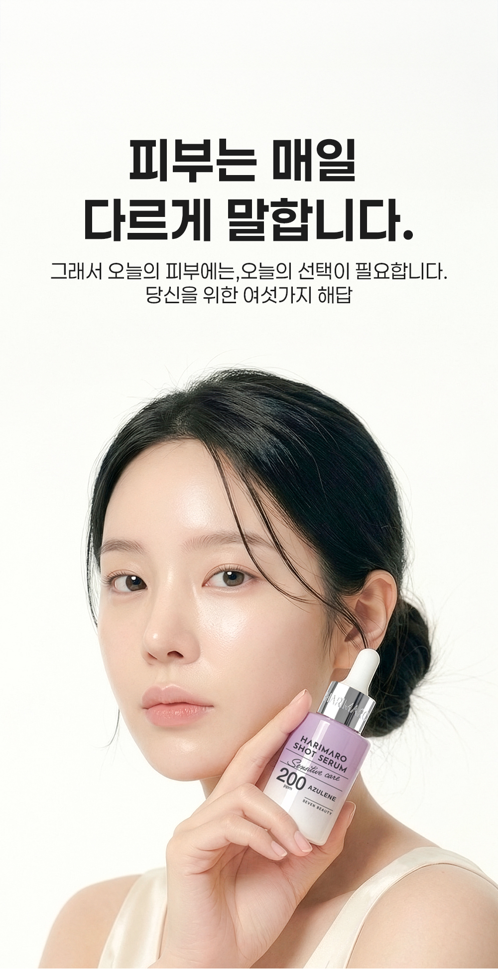 매일 달라지는 피부 컨디션, 이제 고민 부위만 골라 다이렉트로 케어하세요. 하리마로(HARIMARO) 샷 세럼은 6가지 고기능성 성분을 아낌없이 담아낸 맞춤형 다이렉트 솔루션입니다. 정제수 대신 식물 유래 보태니컬 워터를 베이스로 하여, 무너진 피부 밸런스를 건강하게 잡아줍니다. 하리마로 샷 세럼 아줄렌 200ppm [민감 진정] 추천 고민: 외부 자극으로 쉽게 붉어지고 예민해진 피부 핵심 성분: 아줄렌 200ppm + 6종 시카(CICA) 제품 설명: 민감해진 오늘, 피부를 위한 보라색 휴식. 피부를 편안하게 다독이는 아줄렌 성분과 6가지 병풀 유래 성분이 만나 자극받은 피부를 마일드하게 진정시킵니다. 외부 환경으로부터 피부를 보호하고 흔들림 없는 건강한 컨디션을 유지해 줍니다. |